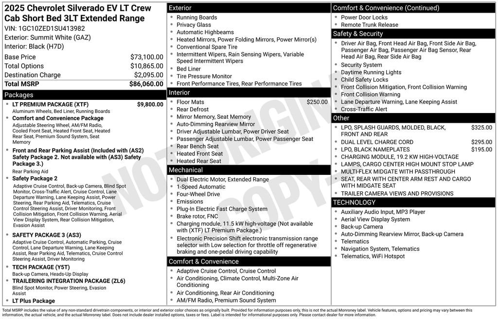 Experience the new Chevrolet Silverado EV, available now at Sky Chevrolet of Provo! With bold design, advanced technology, and dependable performance, Chevrolet makes every mile more exciting. From Utah Valleyâs city streets to mountain canyon drives, the Silverado EV is built to handle it all with confidence. Call 801-356-4300 today to schedule your test drive and see what makes it stand out! Summit White 2025 Chevrolet Silverado EV LT AWD 1-Speed Automatic Electric Motor Price includes: $4000 - Chevrolet Consumer Cash Program