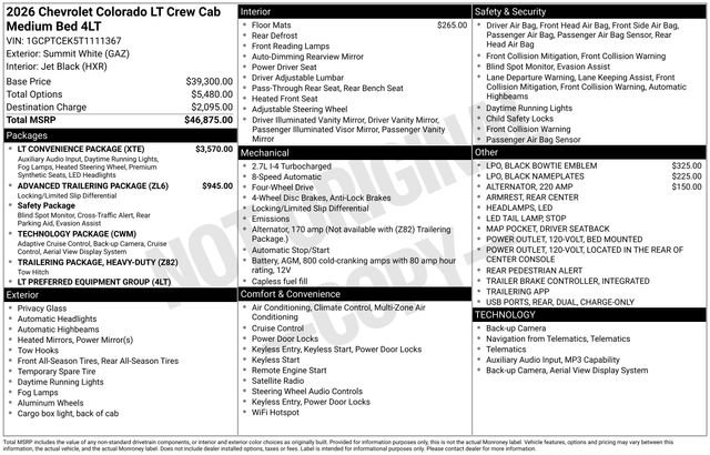 Recent Arrival! Discover the new Chevrolet Colorado at Salt Lake Valley Chevrolet in Salt Lake City! With bold design, modern technology, and reliable performance, Chevrolet makes every drive exciting. Whether itâs city streets or canyon roads, the Colorado is ready for anything. Call us today at 801-969-8221 to schedule a time to see it! --- 2026 Chevrolet Colorado Summit White 2.7L I4 Turbocharged DOHC 16V LEV3-ULEV50 310hp --- Final price excludes tax, tag, title, documentation fees, dealer-installed options, and any market-based pricing adjustments. Financing through GM Financial is required for all discounts to apply. Special finance offers may not be combined with certain factory incentives. While we strive for accuracy, errors may occur please verify all information with a sales representative. For the most accurate pricing, call (801) 969-8221 or visit us in person. Prices and payments are subject to change based on manufacturer incentives. - Price includes - $1000 - Chevrolet Consumer Cash Program - Price includes $1,500 trade in allowance program for customers that own a 2018 or newer passenger car or truck with less than 80,000 miles and trade in their vehicle towards the purchase of a new 2024-2025 Chevrolet. Some restrictions may apply. Contact dealer for details