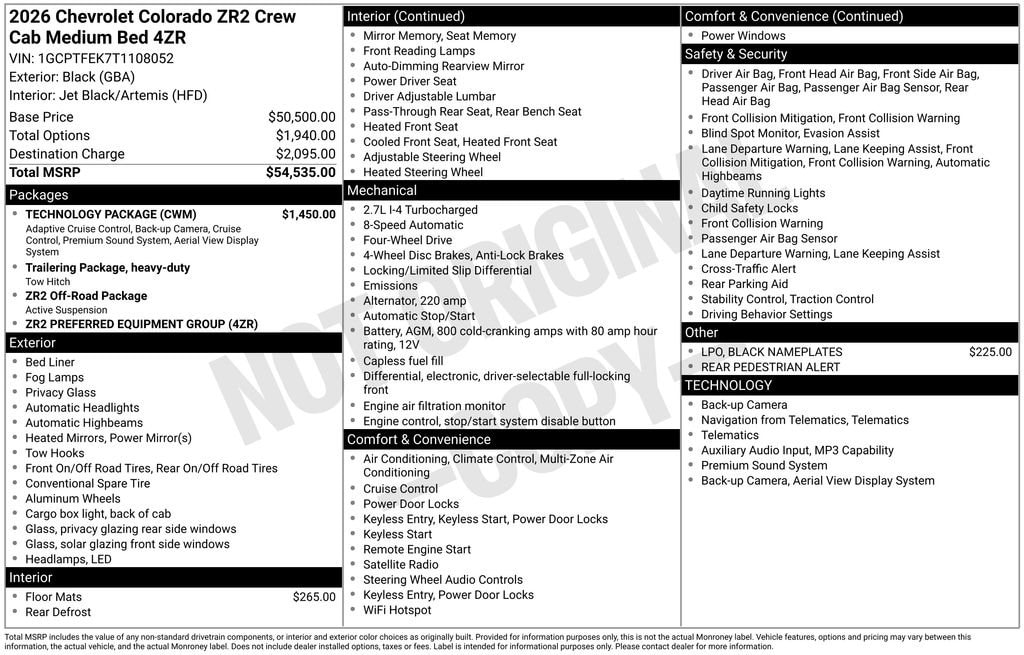 Experience the new Chevrolet Colorado, available now at Sky Chevrolet of Provo! With bold design, advanced technology, and dependable performance, Chevrolet makes every mile more exciting. From Utah Valleyâs city streets to mountain canyon drives, the Colorado is built to handle it all with confidence. Call 801-356-4300 today to schedule your test drive and see what makes it stand out! Black 2026 Chevrolet Colorado ZR2 4WD 8-Speed Automatic 2.7L I4 Turbocharged DOHC 16V LEV3-ULEV50 310hp 4WD.Recent Arrival! Price includes: $500 - Chevrolet Consumer Cash Program