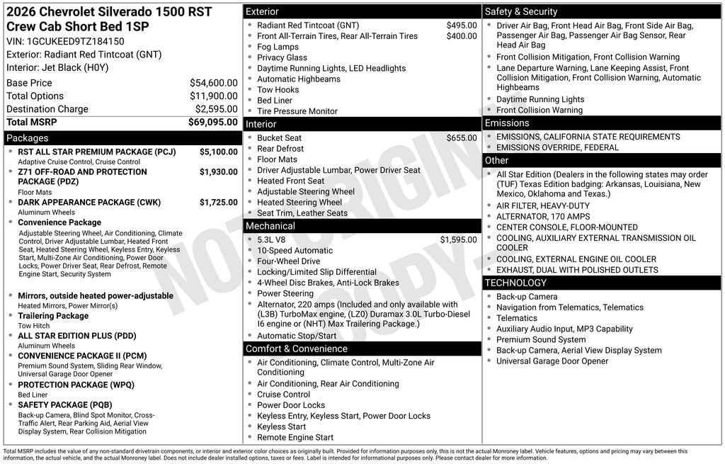 Experience the new Chevrolet Silverado 1500, available now at Sky Chevrolet of Provo! With bold design, advanced technology, and dependable performance, Chevrolet makes every mile more exciting. From Utah Valleyâs city streets to mountain canyon drives, the Silverado 1500 is built to handle it all with confidence. Call 801-356-4300 today to schedule your test drive and see what makes it stand out! Radiant Red Tintcoat 2026 Chevrolet Silverado 1500 RST 4WD 10-Speed Automatic EcoTec3 5.3L V8 10-Speed Automatic, 4WD, Black Leather. Price includes: $1500 - GM Bonus Cash $2000 - Chevrolet Consumer Cash Program Dealer Discount applied to everyone. $1,000 Down Payment Assistance. Must Finance with GM Financial. $1,500 trade in allowance program for customers that own a 2018 or newer passenger car or truck with less than 80,000 miles and trade in their vehicle towards the purchase of a new 2025-2026 New Chevrolet. Some restrictions may apply. Contact dealer for details.