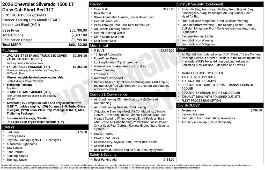 Experience the new Chevrolet Silverado 1500, available now at Sky Chevrolet of Provo! With bold design, advanced technology, and dependable performance, Chevrolet makes every mile more exciting. From Utah Valleyâs city streets to mountain canyon drives, the Silverado 1500 is built to handle it all with confidence. Call 801-356-4300 today to schedule your test drive and see what makes it stand out! Sterling Gray Metallic 2026 Chevrolet Silverado 1500 LT LT1 4WD 10-Speed Automatic EcoTec3 5.3L V8 10-Speed Automatic, 4WD, Black Cloth.