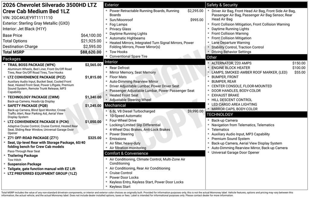 Experience the new Chevrolet Silverado 3500HD, available now at Sky Chevrolet of Provo! With bold design, advanced technology, and dependable performance, Chevrolet makes every mile more exciting. From Utah Valleyâs city streets to mountain canyon drives, the Silverado 3500HD is built to handle it all with confidence. Call 801-356-4300 today to schedule your test drive and see what makes it stand out! Sterling Gray Metallic 2026 Chevrolet Silverado 3500HD LTZ 4WD 10-Speed Automatic Duramax 6.6L V8 Turbodiesel 10-Speed Automatic, 4WD, Jet Black Leather.Recent Arrival! Price includes: $1000 - Chevrolet Consumer Cash Program