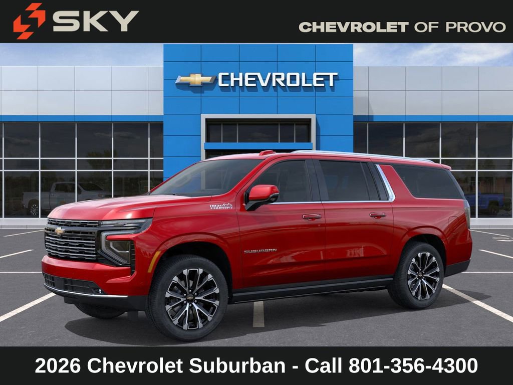 Experience the new Chevrolet Suburban, available now at Sky Chevrolet of Provo! With bold design, advanced technology, and dependable performance, Chevrolet makes every mile more exciting. From Utah Valleyâs city streets to mountain canyon drives, the Suburban is built to handle it all with confidence. Call 801-356-4300 today to schedule your test drive and see what makes it stand out! Radiant Red Tintcoat 2026 Chevrolet Suburban High Country 4WD 10-Speed Automatic with Overdrive EcoTec3 6.2L V8 Price includes: $1,000 Down Payment Assistance. Must Finance with GM Financial. $1,500 trade in allowance program for customers that own a 2018 or newer passenger car or truck with less than 80,000 miles and trade in their vehicle towards the purchase of a new 2025-2026 New Chevrolet. Some restrictions may apply. Contact dealer for details.