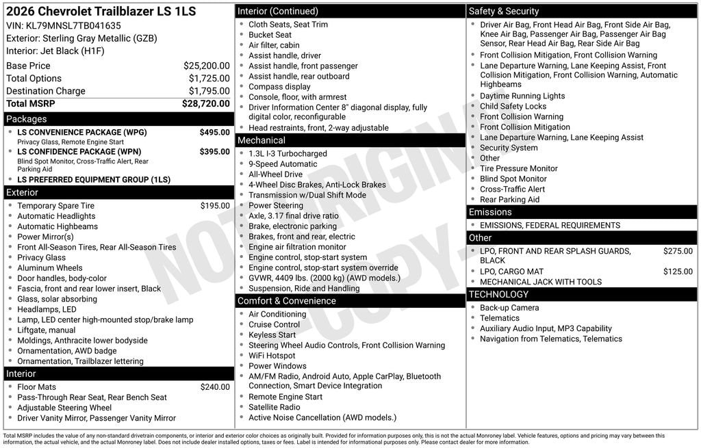 Experience the new Chevrolet TrailBlazer, available now at Sky Chevrolet of Provo! With bold design, advanced technology, and dependable performance, Chevrolet makes every mile more exciting. From Utah Valleyâs city streets to mountain canyon drives, the TrailBlazer is built to handle it all with confidence. Call 801-356-4300 today to schedule your test drive and see what makes it stand out! Sterling Gray Metallic 2026 Chevrolet TrailBlazer LS AWD 9-Speed Automatic 1.3L Ecotec Turbo DOHC SIDI w/VVT