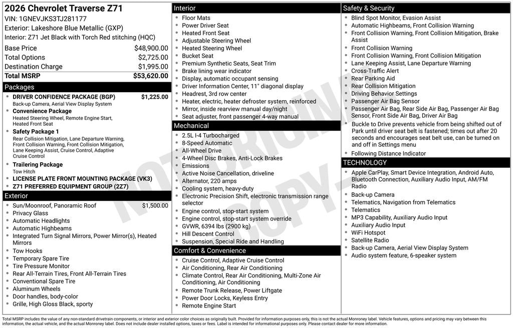 Experience the new Chevrolet Traverse, available now at Sky Chevrolet of Provo! With bold design, advanced technology, and dependable performance, Chevrolet makes every mile more exciting. From Utah Valleyâs city streets to mountain canyon drives, the Traverse is built to handle it all with confidence. Call 801-356-4300 today to schedule your test drive and see what makes it stand out! Lakeshore Blue Metallic 2026 Chevrolet Traverse Z71 AWD 8-Speed Automatic 2.5L DOHC AWD.