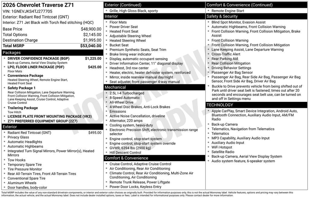 Experience the new Chevrolet Traverse, available now at Sky Chevrolet of Provo! With bold design, advanced technology, and dependable performance, Chevrolet makes every mile more exciting. From Utah Valleyâs city streets to mountain canyon drives, the Traverse is built to handle it all with confidence. Call 801-356-4300 today to schedule your test drive and see what makes it stand out! Radiant Red Tintcoat 2026 Chevrolet Traverse Z71 AWD 8-Speed Automatic 2.5L DOHC AWD.
