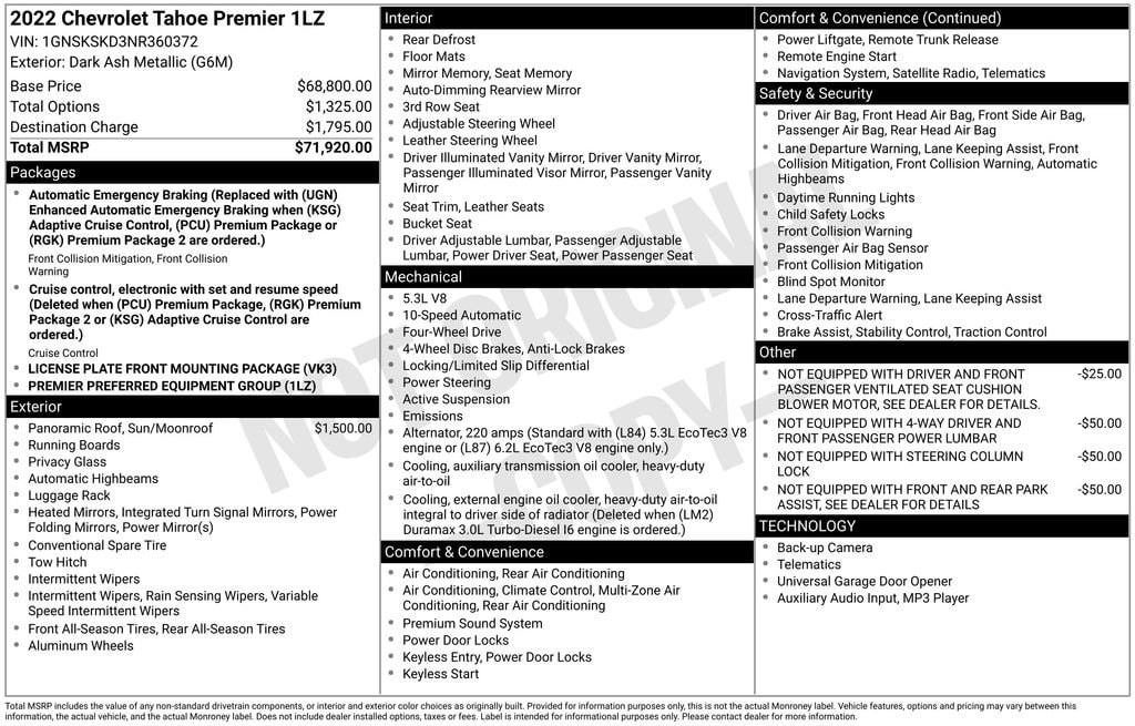 Discover the ultimate in luxury and capability with the 2022 Chevrolet Tahoe Premier. This exceptional SUV is the perfect blend of sophistication and power, designed to elevate your driving experience.Boasting a stunning Gray exterior, the Tahoe Premier is equipped with a range of premium features that set it apart from the competition. Key highlights include:- SUNROOF, POWER PANORAMIC, DUAL-PANE, TILT-SLIDING with express-open and close and power sunshade- Bose 10-Speaker Centerpoint Surround Audio System- Heated & Ventilated Driver & Front Passenger Seats- Heated 2nd Row Outboard Seats- Power Release 2nd Row Bucket Seats- Dual-Pane Power Panoramic SunroofUnder the hood, the Tahoe Premier is powered by the robust EcoTec3 5.3L V8 engine, paired with a 10-Speed Automatic transmission and 4-Wheel Drive. This combination delivers impressive performance and efficiency, with an EPA-estimated 15 city/20 highway MPG.Stepping inside, you'll be greeted by a spacious and well-appointed cabin that exudes luxury. The Tahoe Premier offers a wealth of advanced technology, including the Chevrolet Infotainment 3 Premium System, wireless charging, and a suite of driver assistance features such as Adaptive Suspension, Magnetic Ride Control, and Lane Change Alert with Side Blind Zone Alert.Whether you're embarking on a family road trip or navigating the urban jungle, the 2022 Chevrolet Tahoe Premier is the ultimate companion. Its exceptional capabilities, refined design, and cutting-edge features make it a standout in the full-size SUV segment.Experience the difference for yourself. Visit our showroom today and let us demonstrate why the Tahoe Premier is the perfect choice for your next vehicle.Price excludes tax, title, license fee, government fees, and $449 dealer documentary service fee. While every reasonable effort is made to ensure accuracy, we are not responsible for errors or omissions. Vehicles may be sold prior to inquiry. Please contact dealer to confirm availability. Vehicles listed as ''Not in Stock'' may be available within a reasonable timeframe, not to exceed one week. All financing is subject to approved credit. Check out our 5 Star Google Reviews! Drive a little save a lot.