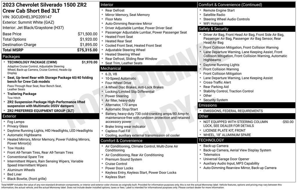 Summit White 2023 Chevrolet Silverado 1500 ZR2 4WD 10-Speed Automatic EcoTec3 6.2L V8 10-Speed Automatic, 4WD, Jet Black/Graystone Leather.Recent Arrival! Odometer is 6852 miles below market average!Check out our 5 Star Google Reviews! Drive a little save a lot. Sale Price Includes $1,000 Finance Savings. Contact Dealer For Details.