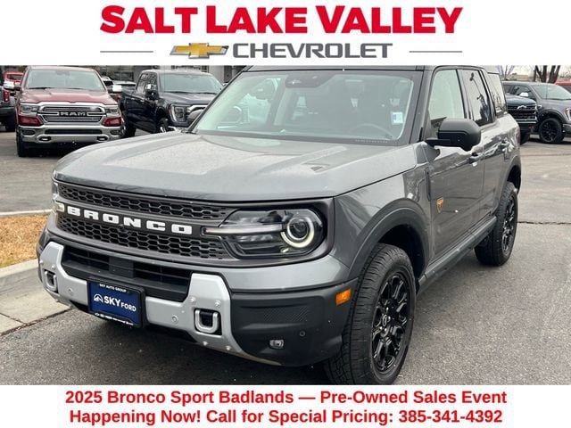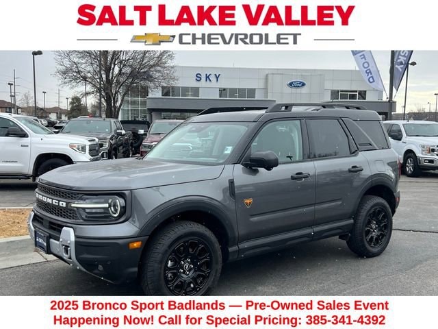 Turn every drive into something special with this Ford Bronco Sport from Salt Lake Valley Chevrolet! Designed for comfort, performance, and style, this vehicle comes fully equipped with modern technology and convenience features youâll love. Plus, enjoy a $1,000 finance savings, already included in the sale price, when you finance through one of our trusted lending partners. If youâre shopping for used cars in Salt Lake City, or searching for the perfect SUV, truck, or sedan, this Ford Bronco Sport delivers the dependability and value youâre looking for. Itâs the ideal match for your lifestyle - ready for everything from mountain adventures to city commutes. Visit Salt Lake Valley Chevrolet today and see why so many Utah drivers trust us for great deals on quality pre-owned vehicles. Explore our inventory online at www.slvchevy.com or call 801-969-8221 to schedule your test drive today! This impressive vehicle includes Equipment Group 400A, 4-Wheel Disc Brakes, 6 Speakers, ABS brakes, Air Conditioning, Alloy wheels, AM/FM radio: SiriusXM, AM/FM Stereo, Auto High-beam Headlights, Auto-dimming Rear-View mirror, Automatic temperature control, Brake assist, Compass, Delay-off headlights, Driver door bin, Driver vanity mirror, Dual front impact airbags, Dual front side impact airbags, Electronic Stability Control, Emergency communication system: SYNC 4 911 Assist, Four wheel independent suspension, Front anti-roll bar, Front Bucket Seats, Front Center Armrest, Front fog lights, Front License Plate Bracket, Front reading lights, Fully automatic headlights, Garage door transmitter, Heated door mirrors, Heated front seats, Heated steering wheel, Illuminated entry, Knee airbag, Leather Trimmed Front Bucket Seats, Low tire pressure warning, Memory seat, Occupant sensing airbag, Outside temperature display, Overhead airbag, Overhead console, Panic alarm, Passenger door bin, Passenger vanity mirror, Power door mirrors, Power driver seat, Power passenger seat, Power steering, Power windows, Radio data system, Rear anti-roll bar, Rear reading lights, Rear seat center armrest, Rear window defroster, Rear window wiper, Remote keyless entry, Security system, SiriusXM, Speed control, Speed-sensing steering, Speed-Sensitive Wipers, Split folding rear seat, Steering wheel mounted audio controls, SYNC 4 w/Enhanced Voice Recognition, Tachometer, Telescoping steering wheel, Tilt steering wheel, Traction control, Trip computer, Variably intermittent wipers, and Wheels: 17 Matte Black-Painted Aluminum, offering everything you need for your next adventure.