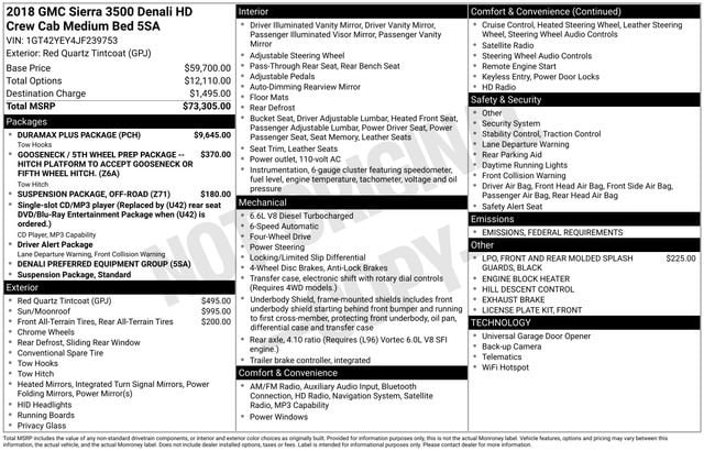 Turn every drive into something special with this GMC Sierra 3500HD from Salt Lake Valley Chevrolet! Designed for comfort, performance, and style, this vehicle comes fully equipped with modern technology and convenience features youâll love. Plus, enjoy a $1,000 finance savings, already included in the sale price, when you finance through one of our trusted lending partners. If youâre shopping for used cars in Salt Lake City, or searching for the perfect SUV, truck, or sedan, this GMC Sierra 3500HD delivers the dependability and value youâre looking for. Itâs the ideal match for your lifestyle - ready for everything from mountain adventures to city commutes. Visit Salt Lake Valley Chevrolet today and see why so many Utah drivers trust us for great deals on quality pre-owned vehicles. Explore our inventory online at www.slvchevy.com or call 801-969-8221 to schedule your test drive today! This impressive vehicle includes Driver Alert Package (Forward Collision Alert and Lane Departure Warning System), Duramax Plus Package (Chrome Recovery Hooks), Gooseneck/5th Wheel Prep Package, Off-Road Suspension Package (Hill Descent Control), Preferred Equipment Group 5SA (110-Volt AC Power Outlet, 150 Amps Alternator, 8 Multi-Color Customizable Driver Display, Auto-Dimming Inside Rear-View Mirror, Chrome Bodyside Moldings, Chrome Door Handles, Chrome Power-Adjustable Heated Outside Mirrors, Color-Keyed Carpeted 1st & 2nd Row Floor Mats, Color-Keyed Carpeting Floor Covering, Deep-Tinted Glass, Driver & Front Passenger Visors, Dual-Zone Automatic Climate Control, Electric Rear-Window Defogger, Electronic Shift Transfer Case, EZ-Lift & Lower Tailgate, Front Body-Color Bumper, Front Frame-Mounted Black Recovery Hooks, Front Halogen Fog Lamps, GMC 4G LTE, GMC Connected Access, HD Radio, Heated & Ventilated Front Seating, Leather Wrapped Heated Steering Wheel, Manual Tilt-Wheel/Telescoping Steering Column, OnStar & GMC Connected Services Capable, Power Adjustable Pedals, Power Sliding Rear Window w/Defogger, Power Windows, Rear 60/40 Folding Bench Seat (Folds Up), Rear Body-Color Bumper w/Bumper CornerSteps, Rear Vision Camera, Rear Wheelhouse Liners, Remote Keyless Entry, Remote Locking Tailgate, Remote Vehicle Starter System, Single-Slot CD/MP3 Player, Steering Wheel Audio Controls, Ultrasonic Front & Rear Park Assist, Unauthorized Entry Theft-Deterrent System, and Universal Home Remote), Standard Suspension Package, Trailering Equipment, 18 Chromed Aluminum Wheels, 4-Wheel Disc Brakes, 7 Speakers, ABS brakes, Adjustable pedals, Air Conditioning, Alloy wheels, AM/FM radio: SiriusXM, Apple CarPlay/Android Auto, Auto-dimming Rear-View mirror, Automatic temperature control, Black Front & Rear Molded Splash Guards (LPO), Bodyside moldings, Bose Speaker System, Brake assist, Bumpers: body-color, CD player, Chrome wheels, Compass, Delay-off headlights, Driver door bin, Driver vanity mirror, Dual front impact airbags, Dual front side impact airbags, Electronic Stability Control, Emergency communication system: OnStar Guidance, Engine Block Heater, Exhaust Brake, Exterior Parking Camera Rear, Floor Mounted Console, Front anti-roll bar, Front Bucket Seats, Front Center Armrest, Front dual zone A/C, Front fog lights, Front Full Feature Bucket Seats, Front License Plate Kit, Front reading lights, Front wheel independent suspension, Fully automatic headlights, Garage door transmitter, Heated door mirrors, Heated Driver & Front Passenger Seats, Heated front seats, Heated steering wheel, High-Intensity Discharge Headlights, Illuminated entry, Memory seat, Navigation System, Occupant sensing airbag, Outside temperature display, Overhead airbag, Overhead console, Panic alarm, Passenger door bin, Passenger vanity mirror, Pedal memory, Perforated Leather-Appointed Seat Trim, Power door mirrors, Power driver seat, Power passenger seat, Power steering, Power Sunroof, Power windows, Premium audio system: GMC Infota
