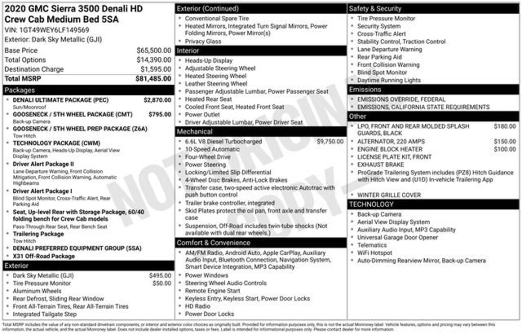 Take your drives to the next level with this GMC Sierra 3500HD from Salt Lake Valley Buick GMC! Engineered for a smooth ride, advanced convenience, and lasting dependability, this vehicle is ready to handle everything your day throws at you. Plus, enjoy a $1,000 finance savings, already included in the sale price, when you finance through one of our trusted lending partners. Looking for quality used cars in Salt Lake City? This GMC Sierra 3500HD delivers style, versatility, and value - perfect for daily commutes, family trips, or weekend adventures. Stop by Salt Lake Valley Buick GMC to see this vehicle in person and explore our wide selection of pre-owned cars, trucks, and SUVs. Browse online at www.slvbuickgmc.com or call 801-265-1511 to schedule your test drive today! With Denali Ultimate Package (Power Sunroof), Driver Alert Package I (Lane Change Alert w/Side Blind Zone Alert, Rear Cross Traffic Alert, and Ultrasonic Front & Rear Park Assist), Driver Alert Package II (Automatic Emergency Braking, Following Distance Indicator, Forward Collision Alert, IntelliBeam Automatic High Beam On/Off, and Lane Departure Warning System), Gooseneck/5th Wheel Package, Gooseneck/5th Wheel Prep Package, Preferred Equipment Group 5SA (12-Volt Rear Auxiliary Power Outlet, 120-Volt Bed Mounted Power Outlet, 120-Volt Instrument Panel Power Outlet, 2 USB Ports (First Row), 2 USB Ports Inside Console, 2-Speed Active Transfer Case, 2nd Row Dual USB Charge-Only Ports, 2nd Row Heated Outboard Seats, 4G LTE Wi-Fi Hotspot Capable, 6 Rectangular Chromed Tubular Assist Steps, Chrome Recovery Hooks, Compass Located In Instrument Cluster, Deep-Tinted Glass, Electric Rear-Window Defogger, Electrical Lock Control Steering Column, Floor-Mounted Center Console, GMC Connected Access Capable, HD Rear Vision Camera, Heated Driver & Front Outboard Passenger Seats, Hitch Guidance w/Hitch View, In-Vehicle Trailering System App, Integrated Trailer Brake Controller, Keyless Open & Start, LED Cargo Area Lighting, Manual Tilt-Wheel/Telescoping Steering Column, OnStar & GMC Connected Services Capable, Polished Exhaust Tip, Power Door Locks, Power Front Passenger Windows w/Express Up/Down, Power Front Windows w/Driver Express Up/Down, Power Rear Windows w/Express Down, Power Sliding Rear Window w/Defogger, ProGrade Trailering System, Rear Wheelhouse Liners, Remote Vehicle Starter System, Safety Alert Seat, Signature Denali Grille w/High Gloss Black Mesh, Spray-On Pickup Bed Liner w/Denali Logo, Steering Wheel Audio Controls, Unauthorized Entry Theft-Deterrent System, Universal Home Remote, Ventilated Driver & Front Passenger Seats, and Wireless Charging), Technology Package (Auto-Dimming Inside Rearview Mirror w/Camera, Bed View Camera, HD Surround Vision w/2 Trailer View Camera Provisions, and Multicolor 15 Diagonal Head-Up Display), X31 Off-Road Package (Hill Descent Control), 10-Way Power Driver Seat Adjuster w/Lumbar, 10-Way Power Passenger Seat Adjuster w/Lumbar, 220 Amp Alternator, 4-Wheel Disc Brakes, 7 Speakers, ABS brakes, Air Conditioning, Alloy wheels, AM/FM radio: SiriusXM with 360L, Apple CarPlay/Android Auto, Auto High-beam Headlights, Auto-dimming door mirrors, Auto-dimming Rear-View mirror, Automatic temperature control, Black Front & Rear Molded Splash Guards (LPO), Bose Premium 7 Speaker Sound System, Brake assist, Bumpers: body-color, Compass, Delay-off headlights, Driver door bin, Driver Memory, Driver vanity mirror, Dual front impact airbags, Dual front side impact airbags, Electronic Stability Control, Engine Block Heater, Exhaust Brake, Forge Perforated Leather-Appointed Seat Trim, Front anti-roll bar, Front Bucket Seats, Front Center Armrest, Front dual zone A/C, Front fog lights, Front License Plate Kit, Front reading lights, Front wheel independent suspension, Fully automatic headlights, Garage door transmitter, Genuine wood console insert, Genuine wood door panel insert, HD Radio, Heated door