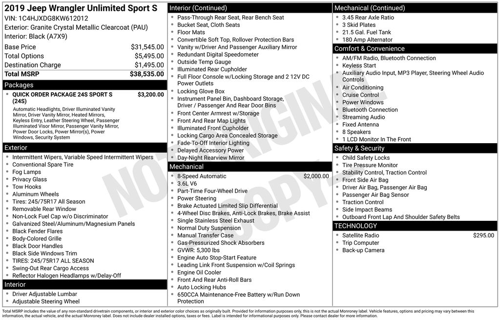 Whether you're looking for a capable off-road vehicle, a versatile daily driver, or a reliable companion for your outdoor pursuits, this 2019 Jeep Wrangler Unlimited Sport S is a fantastic choice. Come in and take it for a test drive today â" we're confident you'll be impressed by its performance, features, and overall value.