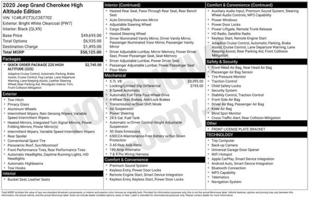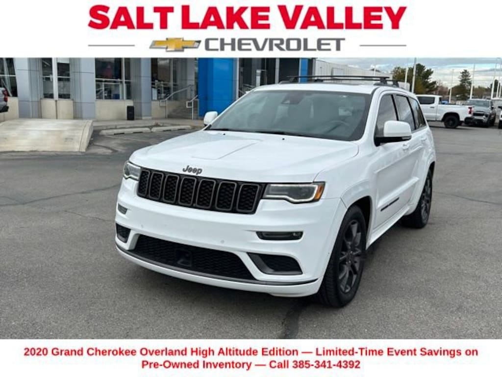 Turn every drive into something special with this Jeep Grand Cherokee from Salt Lake Valley Chevrolet! Designed for comfort, performance, and style, this vehicle comes fully equipped with modern technology and convenience features youâll love. Plus, enjoy a $1,000 finance savings, already included in the sale price, when you finance through one of our trusted lending partners. If youâre shopping for used cars in Salt Lake City, or searching for the perfect SUV, truck, or sedan, this Jeep Grand Cherokee delivers the dependability and value youâre looking for. Itâs the ideal match for your lifestyle - ready for everything from mountain adventures to city commutes. Visit Salt Lake Valley Chevrolet today and see why so many Utah drivers trust us for great deals on quality pre-owned vehicles. Explore our inventory online at www.slvchevy.com or call 801-969-8221 to schedule your test drive today! This impressive vehicle includes Protech II (Adaptive Cruise Control w/Stop, Advanced Brake Assist, Full Speed FWD Collision Warn Plus, Lane Departure Warning Plus, Parallel & Perp Park Assist w/Stop, and Rain Sensitive Windshield Wipers), Quick Order Package 22S High Altitude (7 & 4 Pin Wiring Harness, Anodized/Light Black Chrome Interior Accents, Black Roof Molding, Black Wood Instrument Panel & Door Spears, Body Color Door Handles, Body Color Exterior Mirrors, Body Color Fascias w/Granite Accents, Body Color Sill Extension, Bright Pedals, Class IV Receiver Hitch, Dark Day Light Opening Moldings, Dark Headlamp Bezel Finish, Dark Lens Taillamps, Dual Dark Chrome Exhaust Tip, Granite Crystal Exterior Accents, Granite Crystal Exterior Badging, Granite Crystal/Black Grille, Heavy-Duty Engine Cooling, Leather Wrapped Steering Wheel, Nappa Leather Trimmed Bucket Seats, Premium Accent Claddings, Premium LED Fog Lamps, and Wheels: 20 x 8.0 Low Gloss Granite Crystal), Trailer Tow Group IV, 1-Year SiriusXM Guardian Trial, 10 Speakers, 230MM Rear Axle, 4-Wheel Disc Brakes, 4G LTE Wi-Fi Hot Spot, 8.4 Touchscreen Display, ABS brakes, Active Noise Control System, Air Conditioning, Alloy wheels, AM/FM radio: SiriusXM, Anti-whiplash front head restraints, Apple CarPlay, Apple CarPlay/Android Auto, Audio memory, Auto High-beam Headlights, Auto-dimming door mirrors, Auto-dimming Rear-View mirror, Auto-leveling suspension, Automatic temperature control, Brake assist, Bumpers: body-color, Compass, Delay-off headlights, Driver door bin, Driver vanity mirror, Dual Bright Exhaust Tips, Dual front impact airbags, Dual front side impact airbags, Electronic Limited Slip Differential Rear Axle, Electronic Stability Control, Emergency communication system: SiriusXM Guardian, Engine Oil Cooler, Four wheel independent suspension, Front anti-roll bar, Front Bucket Seats, Front Center Armrest w/Storage, Front dual zone A/C, Front fog lights, Front License Plate Bracket, Front reading lights, Fully automatic headlights, Garage door transmitter, Genuine wood dashboard insert, Google Android Auto, GPS Antenna Input, GPS Navigation, HD Radio, Heated door mirrors, Heated front seats, Heated rear seats, Heated steering wheel, High intensity discharge headlights: Bi-Xenon, Illuminated entry, Integrated Center Stack Radio, Integrated Voice Command w/Bluetooth, Knee airbag, Leather Shift Knob, Leather steering wheel, Leather Trim Seats w/Edge Welting, Low tire pressure warning, Memory seat, Navigation System, Normal Duty Suspension, Occupant sensing airbag, Outside temperature display, Overhead airbag, Overhead console, Panic alarm, ParkView Rear Back-Up Camera, Passenger door bin, Passenger vanity mirror, Power door mirrors, Power driver seat, Power Liftgate, Power moonroof, Power passenger seat, Power steering, Power windows, Quadra-Drive II 4WD System, Radio data system, Radio: Uconnect 4C Nav w/8.4 Display, Rain sensing wipers, Rear anti-roll bar, Rear reading lights, Rear seat center armrest, Rear window defroster, Rear wind
