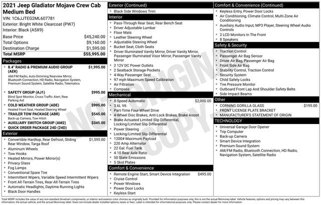 Turn every drive into something special with this Jeep Gladiator from Salt Lake Valley Chevrolet! Designed for comfort, performance, and style, this vehicle comes fully equipped with modern technology and convenience features youâll love. Price excludes tax, title, license fee, government fees, and $449 dealer documentary service fee. While every reasonable effort is made to ensure accuracy, we are not responsible for errors or omissions, and vehicles may be sold prior to inquiry please contact the dealer to confirm availability. All financing is subject to approved credit. If youâre shopping for used cars in Salt Lake City, or searching for the perfect SUV, truck, or sedan, this Jeep Gladiator delivers the dependability and value youâre looking for. Itâs the ideal match for your lifestyle - ready for everything from mountain adventures to city commutes. Visit Salt Lake Valley Chevrolet today and see why so many Utah drivers trust us for great deals on quality pre-owned vehicles. Explore our inventory online at www.slvchevy.com or call 801-969-8221 to schedule your test drive today! This impressive vehicle includes 8.4 Radio & Premium Audio Group (1-Year SiriusXM Guardian Trial, 5-Year SiriusXM Traffic Service, 5-Year SiriusXM Travel Link Service, 8.4 Touchscreen Display, Alpine Premium Audio System, Auto-Dimming Rear-View Mirror, Emergency/Assistance Call, For Details, Visit DriveUconnect.com, GPS Navigation, HD Radio, Radio: Uconnect 4C Nav w/8.4 Display, SiriusXM Traffic Plus, and SiriusXM Travel Link), Auxiliary Switch Group (240 Amp Alternator, 700 Amp Maintenance Free Battery, and Auxiliary Switches), Cold Weather Group (Heated Front Seats and Heated Steering Wheel), Quick Order Package 24D, Safety Group (Blind Spot & Cross Path Detection and ParkSense Rear Park Assist System), Trailer Tow Package (Class IV Hitch Receiver, Heavy-Duty Engine Cooling, and Trailer Hitch Zoom), 4-Wheel Disc Brakes, 4.10 Rear Axle Ratio, 8 Speakers, 97 mph Maximum Speed Calibration, ABS brakes, Air Conditioning, Alloy wheels, AM/FM radio: SiriusXM, Apple CarPlay/Android Auto, Automatic temperature control, Black 3-Piece Hard Top, Brake assist, Compass, Corning Gorilla Glass, Delay-off headlights, Driver door bin, Driver vanity mirror, Dual front impact airbags, Dual front side impact airbags, Electronic Stability Control, Freedom Panel Storage Bag, Front anti-roll bar, Front Bucket Seats, Front Center Armrest w/Storage, Front dual zone A/C, Front fog lights, Front License Plate Bracket, Front reading lights, Fully automatic headlights, Garage door transmitter, Heated door mirrors, Heavy Duty Suspension w/Gas Shocks, Illuminated entry, Integrated roll-over protection, Leather steering wheel, Low tire pressure warning, Manufacturer's Statement of Origin, Occupant sensing airbag, Outside temperature display, Panic alarm, ParkView Rear Back-Up Camera, Passenger door bin, Passenger vanity mirror, Power door mirrors, Power steering, Power windows, Premium Cloth Seats w/Sport Bolsters, Radio data system, Radio: Uconnect 4 w/7 Display, Rear anti-roll bar, Rear reading lights, Rear Sliding Window, Rear Window Defroster, Remote keyless entry, Remote Start System, Security system, Speed control, Split folding rear seat, Steering wheel mounted audio controls, Tachometer, Telescoping steering wheel, Tilt steering wheel, Traction control, Trip computer, Variably intermittent wipers, Voltmeter, and Wheels: 17 x 7.5 Low Gloss Black Aluminum, offering everything you need for your next adventure.