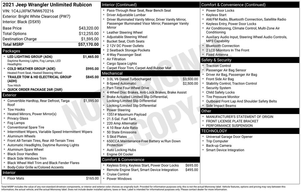 Check out our award winning dealership! 5-star google review, drive a little save a lot. Cold Weather Group (Heated Front Seats and Heated Steering Wheel), LED Lighting Group (Daytime Running Lamps LED Accents, Front LED Fog Lamps, LED Premium Reflector Headlamps, and LED Taillamps), Quick Order Package 26R, Trailer Tow & HD Electrical Group (240 Amp Alternator, 7 & 4 Pin Wiring Harness, 700 Amp Maintenance Free Battery, Auxiliary Switches, and Class II Receiver Hitch), 4-Wheel Disc Brakes, 8 Speakers, ABS brakes, Air Conditioning, Alloy wheels, AM/FM radio: SiriusXM, Apple CarPlay/Android Auto, Automatic temperature control, Aux Battery, Black 3-Piece Hard Top, Brake assist, Compass, Delay-off headlights, Driver door bin, Driver vanity mirror, Dual front impact airbags, Dual front side impact airbags, Electronic Stability Control, Freedom Panel Storage Bag, Front anti-roll bar, Front Bucket Seats, Front Center Armrest w/Storage, Front dual zone A/C, Front fog lights, Front License Plate Bracket, Front reading lights, Fully automatic headlights, Garage door transmitter, Heated door mirrors, Illuminated entry, Integrated roll-over protection, Leather steering wheel, Low tire pressure warning, Manufacturer's Statement of Origin, MOPAR All-Weather Floor Mats (DISC), No Soft Top, Non-Lock Fuel Cap w/o Discriminator, Occupant sensing airbag, Outside temperature display, Panic alarm, ParkView Rear Back-Up Camera, Passenger door bin, Passenger vanity mirror, Performance Suspension, Power door mirrors, Power steering, Power windows, Premium Cloth Low-Back Bucket Seats, Radio data system, Radio: Uconnect 4 w/7" Display, Rear anti-roll bar, Rear reading lights, Rear Window Defroster, Rear Window Wiper/Washer, Remote keyless entry, Remote Proximity Keyless Entry, Remote Start System, Security system, Speed control, Split folding rear seat, Steering wheel mounted audio controls, Stop-Start Dual Battery System, Tachometer, Telescoping steering wheel, Tilt steering wheel, Traction control, Trip computer, Variably intermittent wipers, Voltmeter, and Wheels: 17" x 7.5" Machined w/Black Pockets Sale Price Includes $1,000 Finance Savings. Contact Dealer For Details.