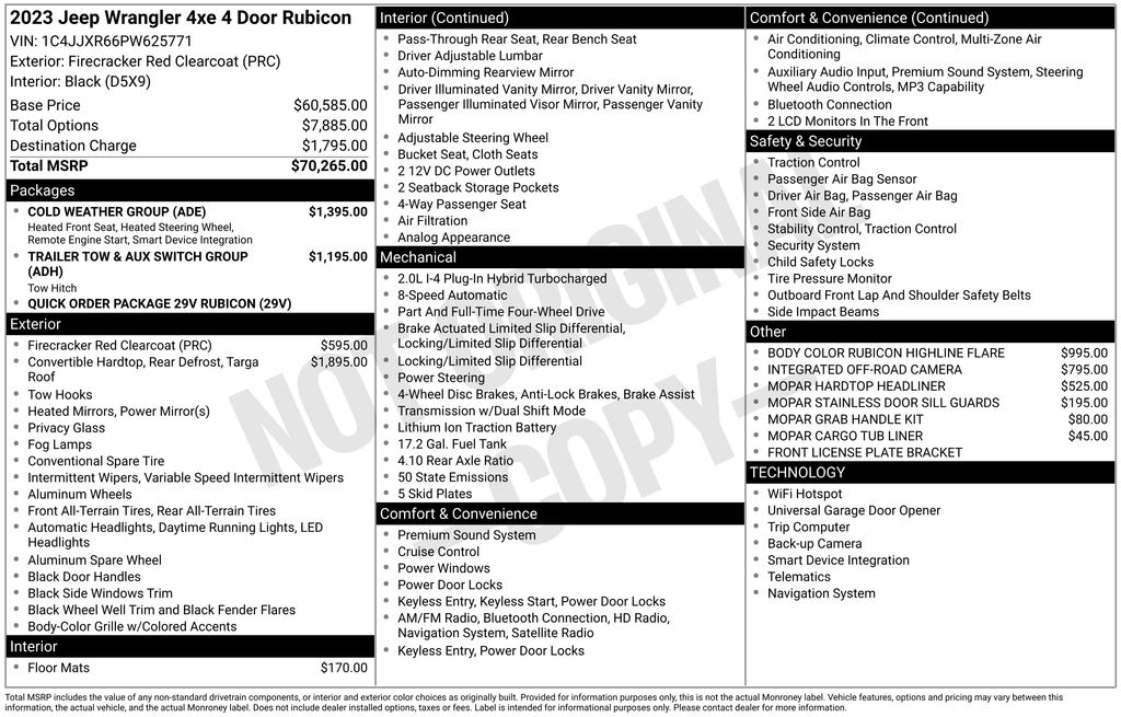 Check out our award winning dealership! 5-star google review, drive a little save a lot. Cold Weather Group (Heated Front Seats, Heated Steering Wheel, and Remote Start System), MOPAR Grab Handle Kit (Front MOPAR Grab Handles and Rear MOPAR Grab Handles), Quick Order Package 29V Rubicon, Trailer Tow & Aux Switch Group (7 & 4 Pin Wiring Harness, 700 Amp Maintenance Free Battery, Auxiliary Switches, and Class II Receiver Hitch), 2.0L I4 DOHC, 4-Wheel Disc Brakes, 4.10 Rear Axle Ratio, 9 Speakers, ABS brakes, Air Conditioning, Alloy wheels, AM/FM radio: SiriusXM, Apple CarPlay/Android Auto, Auto-dimming Rear-View mirror, Automatic temperature control, Black 3-Piece Hard Top, Body Color Rubicon Highline Flare, Brake assist, Compass, Delay-off headlights, Driver door bin, Driver vanity mirror, Dual front impact airbags, Dual front side impact airbags, Electronic Stability Control, Emergency communication system: SiriusXM Guardian, Freedom Panel Storage Bag, Front anti-roll bar, Front Bucket Seats, Front Center Armrest w/Storage, Front dual zone A/C, Front fog lights, Front License Plate Bracket, Front reading lights, Fully automatic headlights, Garage door transmitter, Heated door mirrors, Illuminated entry, Integrated Off-Road Camera, Integrated roll-over protection, Low tire pressure warning, MOPAR All-Weather Floor Mats, MOPAR Cargo Tub Liner, MOPAR Hardtop Headliner, MOPAR Stainless Door Sill Guards, Navigation System, Occupant sensing airbag, Outside temperature display, Panic alarm, ParkView Rear Back-Up Camera, Passenger door bin, Passenger vanity mirror, Performance Suspension, Power door mirrors, Power steering, Power windows, Premium Cloth Low-Back Bucket Seats, Radio data system, Radio: Uconnect 4C Nav w/8.4" Display, Rear anti-roll bar, Rear reading lights, Rear Window Defroster, Rear Window Wiper/Washer, Remote keyless entry, Security system, Speed control, Split folding rear seat, Steering wheel mounted audio controls, Tachometer, Telescoping steering wheel, Tilt steering wheel, Traction control, Trip computer, Variably intermittent wipers, Voltmeter, and Wheels: 17" x 7.5" Machined w/Black Pockets Sale Price Includes $1,000 Finance Savings. Contact Dealer For Details.