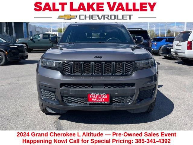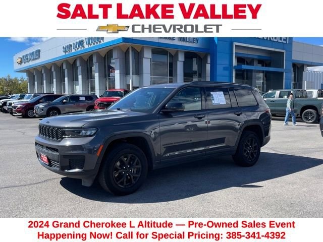 Turn every drive into something special with this Jeep Grand Cherokee L from Salt Lake Valley Chevrolet! Designed for comfort, performance, and style, this vehicle comes fully equipped with modern technology and convenience features youâll love. Price excludes tax, title, license fee, government fees, and $449 dealer documentary service fee. While every reasonable effort is made to ensure accuracy, we are not responsible for errors or omissions, and vehicles may be sold prior to inquiry please contact the dealer to confirm availability. All financing is subject to approved credit. If youâre shopping for used cars in Salt Lake City, or searching for the perfect SUV, truck, or sedan, this Jeep Grand Cherokee L delivers the dependability and value youâre looking for. Itâs the ideal match for your lifestyle - ready for everything from mountain adventures to city commutes. Visit Salt Lake Valley Chevrolet today and see why so many Utah drivers trust us for great deals on quality pre-owned vehicles. Explore our inventory online at www.slvchevy.com or call 801-969-8221 to schedule your test drive today! This impressive vehicle includes Altitude Appearance Package, Quick Order Package 23B Altitude (115V Auxiliary Power Outlet, 3rd Row Charge-Only USB Ports, Black Headliner, Capri Leatherette/Suede Seats, Delete Laredo Badge, Gloss Black Exterior Accents, Heated Front Seats, Heated Steering Wheel, Power Liftgate, Rain Sensitive Windshield Wipers, Remote Start System, Selectable Tire Fill Alert, Wheels: 18 x 8.0 Fully Painted Aluminum 1, and Wireless Charging Pad), 2nd Row 60/40 Bench w/Manual Tip/Slide, 2nd Row Seat Center Armrest/Cupholders, 3 Rear Seat Head Restraints, 3.45 Rear Axle Ratio, 3rd row seats: split-bench, 4-Wheel Disc Brakes, 6 Speakers, 7-Passenger Seating, ABS brakes, Air Conditioning, Alloy wheels, Anti-whiplash front head restraints, Automatic temperature control, Brake assist, Bumpers: body-color, Center Rear 3-Point Seat Belt, Cloth Seats, Compass, Delay-off headlights, Driver door bin, Driver vanity mirror, Dual front impact airbags, Dual front side impact airbags, Electronic Stability Control, Emergency communication system, Four wheel independent suspension, Front anti-roll bar, Front Bucket Seats, Front Center Armrest w/Storage, Front dual zone A/C, Front License Plate Bracket, Front reading lights, Fully automatic headlights, Heated door mirrors, Illuminated entry, Knee airbag, Low tire pressure warning, Manual Fold Seatbacks, Normal Duty Suspension, Occupant sensing airbag, Outside temperature display, Overhead airbag, Overhead console, Panic alarm, ParkView Rear Back-Up Camera, Passenger door bin, Passenger vanity mirror, Power door mirrors, Power driver seat, Power steering, Power windows, Radio data system, Radio: Uconnect 5 w/8.4 Display, Rear air conditioning, Rear anti-roll bar, Rear reading lights, Rear window defroster, Rear window wiper, Reclining 3rd row seat, Remote keyless entry, Security system, Speed control, Speed-Sensitive Wipers, Split folding rear seat, Spoiler, Steering wheel mounted audio controls, Tachometer, Telescoping steering wheel, Tilt steering wheel, Traction control, Trip computer, Variably intermittent wipers, Voltmeter, and Wheels: 18 x 8.0 Fully Painted Aluminum, offering everything you need for your next adventure.