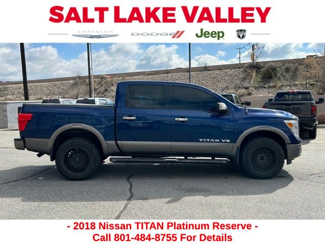 Get ready to hit the road in this Nissan Titan, a standout choice for drivers looking for reliability, performance, and style! This impressive vehicle is packed with premium features designed to make every drive more enjoyable. Plus, youâll enjoy a $1,000 finance savings, already included in the sale price, when you finance through one of our trusted lending partners. Whether youâre searching for used cars in Salt Lake City, a dependable SUV, or a powerful truck, this Nissan Titan delivers everything you need and more. Visit Salt Lake Valley Chrysler Dodge Jeep Ram today to test drive or explore our entire selection of quality pre-owned vehicles. Donât wait - shop online at www.slvcdjr.com or call 801-484-8755 to learn more! This amazing vehicle comes loaded with options like Platinum Reserve Utility Bed Package (5.5' TITAN Box and Rear Bumper Step (B13)), Platinum Utility Package (TITAN Box), 12 Speakers, 2.937 Axle Ratio, 4-Wheel Disc Brakes, ABS brakes, Activation Disclaimer, Air Conditioning, Alloy wheels, AM/FM radio: SiriusXM, Auto tilt-away steering wheel, Auto-dimming door mirrors, Auto-dimming Rear-View mirror, Automatic temperature control, Blind Spot Warning, Brake assist, CD player, Chrome wheels, Compass, Delay-off headlights, Door Sill Kick Plates, Driver door bin, Driver vanity mirror, Dual front impact airbags, Dual front side impact airbags, Electronic Stability Control, Emergency communication system: NissanConnect Services, Floor Mats, Front anti-roll bar, Front Bucket Seats, Front Center Armrest, Front dual zone A/C, Front fog lights, Front reading lights, Front wheel independent suspension, Garage door transmitter: HomeLink, Heated & Cooled Front Captain's Chairs, Heated door mirrors, Heated front seats, Heated rear seats, Heated steering wheel, Illuminated entry, Illuminated running boards, Leather Shift Knob, Leather steering wheel, LED Fog Lights w/Dark Chrome Bezel, Low tire pressure warning, Memory seat, Navigation System, NissanConnect Services Powered By SiriusXM, Occupant sensing airbag, Outside temperature display, Overhead airbag, Overhead console, Panic alarm, Passenger door bin, Passenger vanity mirror, Power door mirrors, Power driver seat, Power passenger seat, Power steering, Power windows, Premium Leather Seat Trim, Radio data system, Radio: NissanConnect w/SiriusXM/Navi & Mobile Apps, Rain sensing wipers, Rear anti-roll bar, Rear seat center armrest, Rear step bumper, Rear window defroster, Remote keyless entry, Running Boards w/Dark Chrome, Security system, Speed control, Speed-sensing steering, Speed-Sensitive Wipers, Split folding rear seat, Steering wheel memory, Steering wheel mounted audio controls, Tachometer, Telescoping steering wheel, Tilt steering wheel, Traction control, Trip computer, Turn signal indicator mirrors, Variably intermittent wipers, Ventilated front seats, Voltmeter, and Wheels: 20" x 8" Dark Chrome Clad, making it the perfect choice for your next adventure.