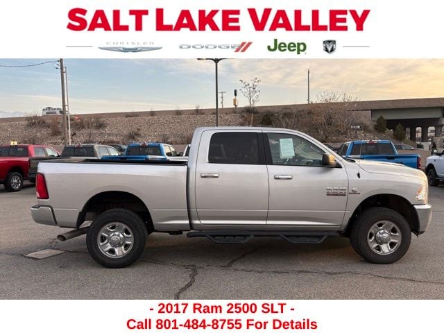 Get ready to hit the road in this Ram 2500, a standout choice for drivers looking for reliability, performance, and style! This impressive vehicle is packed with premium features designed to make every drive more enjoyable. Plus, youâll enjoy a $1,000 finance savings, already included in the sale price, when you finance through one of our trusted lending partners. Whether youâre searching for used cars in Salt Lake City, a dependable SUV, or a powerful truck, this Ram 2500 delivers everything you need and more. Visit Salt Lake Valley Chrysler Dodge Jeep Ram today to test drive or explore our entire selection of quality pre-owned vehicles. Donât wait - shop online at www.slvcdjr.com or call 801-484-8755 to learn more! This amazing vehicle comes loaded with options like Quick Order Package 2FG SLT (Front Armrest w/Cupholders), 180 Amp Alternator, 4-Wheel Disc Brakes, 40/20/40 Split Bench Seat, 6 Speakers, ABS brakes, Air Conditioning, AM/FM radio: SiriusXM, Black Exterior Mirrors, Brake assist, Bumpers: chrome, Center Hub, Charge Only Remote USB Port, Cloth 40/20/40 Bench Seat, Compass, Delay-off headlights, Driver door bin, Dual front impact airbags, Dual front side impact airbags, Electronic Stability Control, Electronically Controlled Throttle, Exterior Mirrors w/Heating Element, Front & Rear Rubber Floor Mats, Front anti-roll bar, Front Center Armrest w/Storage, Front reading lights, Fully automatic headlights, GPS Antenna Input, Heated door mirrors, Hemi Badge, Illuminated entry, Integrated Voice Command w/Bluetooth, Locking Tailgate, Low tire pressure warning, Manual Adjust Seats, Manufacturer's Statement of Origin, Media Hub (USB, AUX), Next Generation Engine Controller, Occupant sensing airbag, Outside temperature display, Overhead airbag, Overhead console, Panic alarm, Passenger door bin, Passenger vanity mirror, Power door mirrors, Power steering, Power windows, Radio data system, Radio: Uconnect 3 w/5" Display, Rear seat center armrest, Rear step bumper, Remote keyless entry, SiriusXM Satellite Radio, Speed control, Tachometer, Tilt steering wheel, Tip Start, Traction control, Trip computer, Variably intermittent wipers, Vendor Painted Cargo Box Tracking, Voltmeter, and Wheels: 18" x 8.0" Steel Chrome Clad, making it the perfect choice for your next adventure.