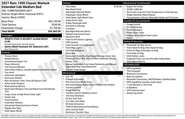 Turn every drive into something special with this Ram 1500 Classic from Salt Lake Valley Chevrolet! Designed for comfort, performance, and style, this vehicle comes fully equipped with modern technology and convenience features youâll love. Price excludes tax, title, license fee, government fees, and $449 dealer documentary service fee. While every reasonable effort is made to ensure accuracy, we are not responsible for errors or omissions, and vehicles may be sold prior to inquiry please contact the dealer to confirm availability. All financing is subject to approved credit. If youâre shopping for used cars in Salt Lake City, or searching for the perfect SUV, truck, or sedan, this Ram 1500 Classic delivers the dependability and value youâre looking for. Itâs the ideal match for your lifestyle - ready for everything from mountain adventures to city commutes. Visit Salt Lake Valley Chevrolet today and see why so many Utah drivers trust us for great deals on quality pre-owned vehicles. Explore our inventory online at www.slvchevy.com or call 801-969-8221 to schedule your test drive today! This impressive vehicle includes Quick Order Package 29F Warlock (4x4 Flat Black Badge, Bi-Function Halogen Projector Headlamps, Black Door Handles, Black Exterior Truck Badging, Black Grille w/RAM Lettering, Black Headlamp Filler Panel, Black Powder Coated Front Bumper, Black Powder Coated Rear Bumper, Black RAM Head Tailgate Badge, Black Wheel Flares, Front Wheel Well Liners, ParkSense Rear Park Assist System, Raised Ride Height, Rear Extra HD Shock Absorbers, Semi-Gloss Black Hub, Sport Tail Lamps, Warlock, Warlock Interior Accents, and Wheels: 20 x 9 Semi-Gloss Black Aluminum), Remote Start & Security Alarm Group (Remote Start System and Security Alarm), 3.21 Rear Axle Ratio, 4-Wheel Disc Brakes, 40/20/40 Split Bench Seat, 6 Speakers, ABS brakes, Active Grille Shutters, Air Conditioning, Alloy wheels, AM/FM radio: SiriusXM, Black Exterior Mirrors, Brake assist, Bumpers: chrome, Center Hub, Charge Only Remote USB Port, Cloth 40/20/40 Bench Seat, Compass, Delay-off headlights, Driver door bin, Dual front impact airbags, Dual front side impact airbags, Electronic Shift, Electronic Stability Control, Exterior Mirrors w/Heating Element, Front anti-roll bar, Front Armrest w/3 Cupholders, Front Center Armrest w/Storage, Front License Plate Bracket, Front reading lights, Front wheel independent suspension, Fully automatic headlights, GPS Antenna Input, Heated door mirrors, Illuminated entry, Integrated Voice Command w/Bluetooth, Low tire pressure warning, MOPAR Front & Rear Rubber Floor Mats, Occupant sensing airbag, Outside temperature display, Overhead airbag, Overhead console, Panic alarm, ParkView Rear Back-Up Camera, Passenger door bin, Passenger vanity mirror, Power door mirrors, Power steering, Power windows, Radio data system, Radio: Uconnect 3 w/5 Display, Rear anti-roll bar, Rear step bumper, Remote keyless entry, Rotary Shifter-Black, Speed control, Tachometer, Tilt steering wheel, Tip Start, Traction control, Trip computer, Variably intermittent wipers, and Voltmeter, offering everything you need for your next adventure.Clean CARFAX.