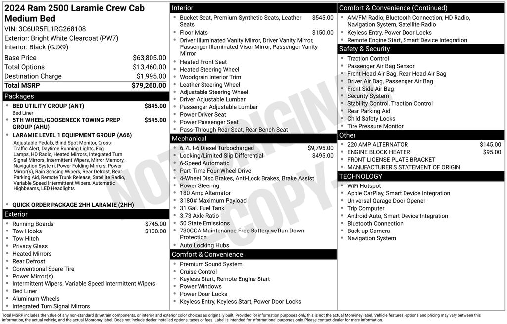 Check out our award winning dealership! 5-star google review, drive a little save a lot. Bed Utility Group (LED Bed Lighting, MOPAR Deployable Bed Step, and MOPAR Spray In Bedliner), Laramie Level 1 Equipment Group (12" Touchscreen Display, 2nd Row In Floor Storage Bins, 4G LTE Wi-Fi Hot Spot, Alexa Built-In, Apple CarPlay, Auto Adjust In Reverse Exterior Mirrors, Auto Dim Exterior Mirror, Auto High Beam Headlamp Control, Auto Power-Folding Mirrors, Auto-Dimming Exterior Passenger Mirror, Blind Spot & Cross Path Detection, Center Hub, Chrome Exterior Mirrors, Connected Travel & Traffic Services, Connectivity - US/Canada, Disassociated Touchscreen Display, Exterior Mirrors Courtesy Lamps, Exterior Mirrors w/Heating Element, Exterior Mirrors w/Memory, Exterior Mirrors w/Supplemental Signals, Foam Bottle Insert (Door Trim Panel), For Details, Visit DriveUconnect.com, For More Info, Call 800-643-2112, Forward & Reverse Utility Lights, Front LED Fog Lamps, Global Telematics Box Module (TBM), Google Android Auto, GPS Antenna Input, GPS Navigation, HD Radio, Integrated Voice Command w/Bluetooth, LED Reflector Headlamps, LED Tail Lamps, Mirror Running Lights, Off-Road Information Pages, ParkSense Front/Rear Park Assist System, Power Adjust Mirrors, Power Adjustable Convex Aux Mirrors, Power Adjustable Pedals w/Memory, Power Heated Fold Telescopic Mirrors w/Memory, Power Telescoping Mirrors, Radio: Uconnect 5 Nav w/12.0" Display, Rain Sensitive Windshield Wipers, Rear Power Sliding Window, Rear Window Defroster, Remote Tailgate Release, Selectable Tire Fill Alert, SiriusXM Radio Service, SiriusXM w/360L, Trailer Tow Pages, and Wheels: 18" x 8.0" Polished Aluminum), Quick Order Package 2HH Laramie, 10 Speakers, 115V Auxiliary Rear Power Outlet, 2 Way Rear Headrest Seat, 220 Amp Alternator, 3.73 Axle Ratio, 4 Way Front Headrests, 4-Wheel Disc Brakes, 5th Wheel/Gooseneck Towing Prep Group, ABS brakes, Active Noise Control System, Air Conditioning, Alloy wheels, AM/FM radio: SiriusXM with 360L, Anti-Spin Differential Rear Axle, Apple CarPlay/Android Auto, Automatic temperature control, Brake assist, Bumpers: body-color, Chrome Flat Wheel-to-Wheel Side Steps, Compass, Delay-off headlights, Driver door bin, Driver vanity mirror, Dual front impact airbags, Dual front side impact airbags, Electronic Stability Control, Electronically Controlled Throttle, Engine Block Heater, Front anti-roll bar, Front Center Armrest w/Storage, Front dual zone A/C, Front License Plate Bracket, Front reading lights, Front Seat Back Map Pockets, Fully automatic headlights, Garage door transmitter, Heated door mirrors, Heated Front Seats, Heated front seats, Heated Steering Wheel, Heated steering wheel, Illuminated entry, Leather steering wheel, Leather Trim 40/20/40 Bench Seat, Low tire pressure warning, Manufacturer's Statement of Origin, MOPAR Front & Rear Rubber Floor Mats, Navigation System, Occupant sensing airbag, Outside temperature display, Overhead airbag, Overhead console, Panic alarm, ParkView Rear Back-Up Camera, Passenger door bin, Passenger vanity mirror, Power 2-Way Driver Lumbar Adjust, Power 2-Way Passenger Lumbar Adjust, Power Adjust 8-Way Driver Seat, Power Adjust 8-Way Front Passenger Seat, Power door mirrors, Power driver seat, Power passenger seat, Power steering, Power windows, Radio data system, Rear 60/40 Folding Seat, Rear anti-roll bar, Rear reading lights, Rear seat center armrest, Rear step bumper, Rear window defroster, Remote keyless entry, Security system, Speed control, Split folding rear seat, Steering wheel mounted audio controls, Tachometer, Tilt steering wheel, Tip Start, Tow Hooks, Traction control, Trip computer, Turn signal indicator mirrors, Variably intermittent wipers, and Voltmeter Sale Price Includes $1,000 Finance Savings. Contact Dealer For DetailS.