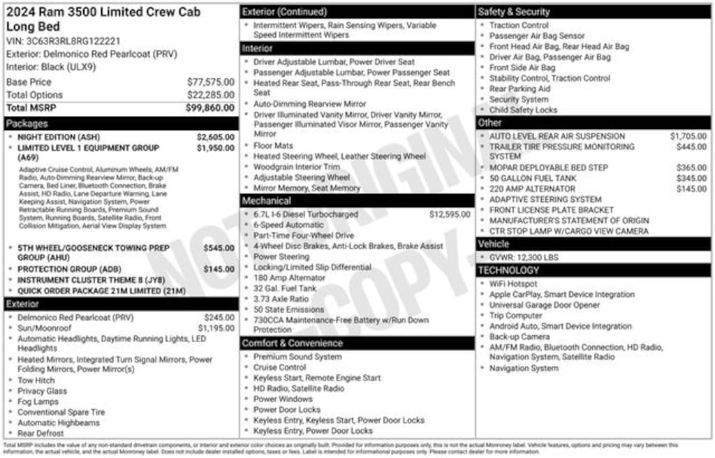 Get ready to hit the road in this Ram 3500, a standout choice for drivers looking for reliability, performance, and style! This impressive vehicle is packed with premium features designed to make every drive more enjoyable. Plus, youâll enjoy a $1,000 finance savings, already included in the sale price, when you finance through one of our trusted lending partners. Whether youâre searching for used cars in Salt Lake City, a dependable SUV, or a powerful truck, this Ram 3500 delivers everything you need and more. Visit Salt Lake Valley Chrysler Dodge Jeep Ram today to test drive or explore our entire selection of quality pre-owned vehicles. Donât wait - shop online at www.slvcdjr.com or call 801-484-8755 to learn more! This amazing vehicle comes loaded with options like Limited Level 1 Equipment Group (12" Touchscreen Display, 17 Speaker harman/kardon Premium Sound, 4G LTE Wi-Fi Hot Spot, Adaptive Cruise Control w/Stop, Adaptive Steering System, Alexa Built-In, Apple CarPlay, Center Hub, Connected Travel & Traffic Services, Connectivity - US/Canada, CTR Stop Lamp w/Cargo View Camera, Digital Rearview Mirror, Disassociated Touchscreen Display, For Details Visit DriveUconnect.com, For More Info, Call 800-643-2112, Full Speed Forward Collision Warning Plus, Global Telematics Box Module (TBM), Google Android Auto, GPS Antenna Input, GPS Navigation, HD Radio, Integrated Voice Command w/Bluetooth, Lane Keep Assist, LED Bed Lighting, MOPAR Spray In Bedliner, Off-Road Information Pages, Power Deployable Running Boards, Radio: Uconnect 5 Nav w/12.0" Display, Ramcharger Wireless Charging Pad, Selectable Tire Fill Alert, SiriusXM Radio Service, SiriusXM w/360L, Surround View Camera System, Trailer Reverse Guidance, Trailer Tow Pages, and Wheels: 20" x 8.0" Satin Carbon w/Chrome Insert), Night Edition (Black Exterior Truck Badging, Black Headlamp Bezels, Black Limited Grille, Black RAM Head Tailgate Badge, Black Tail Lamp Bezels, Black Wheel Center Hub, Body Color Grille Surround, and Sport Performance Hood), Protection Group, Quick Order Package 21M Limited, 10 Speakers, 220 Amp Alternator, 3.73 Axle Ratio, 4-Wheel Disc Brakes, 50 Gallon Fuel Tank, 5th Wheel/Gooseneck Towing Prep Group, 8.4" Touchscreen Display, ABS brakes, Active Noise Control System, Adjustable pedals, Air Conditioning, Alloy wheels, AM/FM radio: SiriusXM with 360L, Apple CarPlay/Android Auto, Audio memory, Auto High-beam Headlights, Auto Level Rear Air Suspension, Auto-dimming door mirrors, Auto-dimming Rear-View mirror, Automatic temperature control, Bodyside moldings, Brake assist, Bumpers: body-color, Compass, Delay-off headlights, Driver door bin, Driver vanity mirror, Dual front impact airbags, Dual front side impact airbags, Electronic Stability Control, Electronically Controlled Throttle, Front anti-roll bar, Front Bucket Seats, Front Center Armrest w/Storage, Front dual zone A/C, Front fog lights, Front License Plate Bracket, Front reading lights, Fully automatic headlights, Garage door transmitter, Genuine wood console insert, Genuine wood dashboard insert, Genuine wood door panel insert, Heated door mirrors, Heated front seats, Heated rear seats, Heated steering wheel, Illuminated entry, Instrument Cluster Theme 8, Integrated Center Stack Radio, Leather steering wheel, Limited Leather Bucket Seats, Low tire pressure warning, Luxury Door Trim Panel (CTH), Manufacturer's Statement of Origin, Memory seat, MOPAR Deployable Bed Step, Navigation System, Occupant sensing airbag, Outside temperature display, Overhead airbag, Overhead console, Panic alarm, ParkView Rear Back-Up Camera, Passenger door bin, Passenger vanity mirror, Pedal memory, Power door mirrors, Power driver seat, Power passenger seat, Power steering, Power Sunroof, Power windows, Radio data system, Radio: Uconnect 5 Nav w/8.4" Display, Rain sensing wipers, Rear reading lights, Rear seat center armrest, Rear step bumper, Rear window defroster, Remote keyless entry, Security system, Speed control