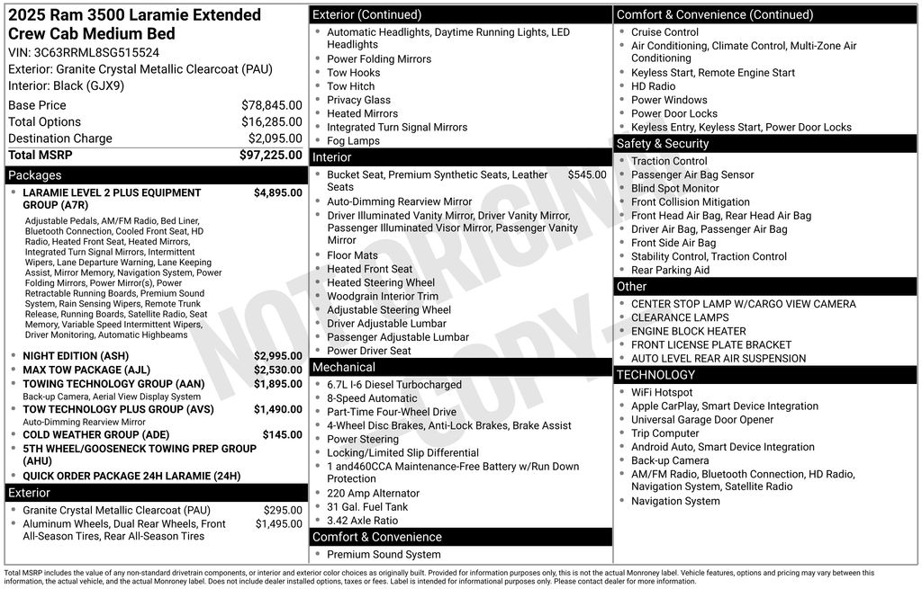 Check out our award winning dealership! 5-star google review, drive a little save a lot. Cold Weather Group (Engine Block Heater and MOPAR Winter Front Grille Cover), Laramie Level 2 Plus Equipment Group (#1 Seat Foam Cushion, 115V Auxiliary Rear Power Outlet, 14.4" Touchscreen Display, 17 Speaker harman/kardon Premium Sound, 2 Way Rear Headrest Seat, 4 Way Front Headrests, 4G LTE Wi-Fi Hot Spot, Active Lane Management System, Adaptive Steering System, Alexa Built-In, Apple CarPlay, Auto Adjust In Reverse Exterior Mirrors, Auto Dim Exterior Mirror, Auto High Beam Headlamp Control, Auto-Dimming Exterior Passenger Mirror, Bucket Seats, Center Stop Lamp w/Cargo View Camera, Chrome Exterior Mirrors, Connected Travel & Traffic Services, Connectivity - US/Canada, Disassociated Touchscreen Display, Drowsy Driver Detection, Dual Wireless Charging Pad, Emergency Vehicle Alert System (EVAS), Exterior Mirrors Courtesy Lamps, Exterior Mirrors w/Heating Element, Exterior Mirrors w/Memory, Exterior Mirrors w/Supplemental Signals, Foam Bottle Insert (Door Trim Panel), For Details Visit DriveUconnect.com, For More Info, Call 800-643-2112, Forward & Reverse Utility Lights, Front Seat Back Map Pockets, Full Length Upgraded Floor Console, Global Telematics Box Module (TBM), Google Android Auto, GPS Antenna Input, GPS Navigation, HD Radio, Heated Front Seats, Heated Steering Wheel, High Back Seats, Integrated Voice Command w/Bluetooth, Leather Trimmed Bucket Seats, LED Bed Lighting, Mirror Running Lights, MOPAR Deployable Bed Step, MOPAR Spray In Bedliner, Off-Road Information Pages, Power 2-Way Driver Lumbar Adjust, Power 2-Way Passenger Lumbar Adjust, Power Adjust 8-Way Driver Seat, Power Adjust 8-Way Front Passenger Seat, Power Adjust Mirrors, Power Adjustable Pedals w/Memory, Power Deployable Running Boards, Power Heated Folding Telescopic Mirrors w/Memory, Power Telescoping Mirrors, Power-Adjustable Convex Aux Mirrors, Radio: Uconnect 5 Nav w/14.4" Display, Radio/Driver Seat/Mirrors/Pedals Memory, Rain Sensitive Windshield Wipers, Rear 60/40 Folding Seat, Remote Tailgate Release, Selectable Tire Fill Alert, SiriusXM Radio Service, SiriusXM w/360L, Traffic Sign Recognition, Trailer Tow Pages, and Ventilated Front Seats), Max Tow Package (5th Wheel/Gooseneck Towing Prep Group and Auto Level Rear Air Suspension), Night Edition (Black Exterior Truck Badging, Black Wheel Center Hub, Body Color Grille Surround, Gloss Black Grille Billets/Accents, and Sport Performance Hood), Quick Order Package 24H Laramie, Tow Technology Plus Group (Auxiliary Switches Prep, Digital 3.0 Rear View Auto Dim Mirror, and Trailer Reverse Steering Control), Towing Technology Group (Surround View Camera System, Trailer Reverse Guidance, and Trailer Tire Pressure Monitoring System), 10 Speakers, 3.42 Axle Ratio, 4-Wheel Disc Brakes, 6000# Front Axle w/Hub Ext, ABS brakes, Air Conditioning, Alloy wheels, AM/FM radio: SiriusXM with 360L, Apple CarPlay/Android Auto, Auto Power-Folding Mirrors, Auto-dimming Rear-View mirror, Automatic temperature control, Box & Rear Fender Clearance Lamps, Brake assist, Bumpers: body-color, Center Hub, Clearance Lamps, Compass, Delay-off headlights, Driver door bin, Driver vanity mirror, Dual front impact airbags, Dual front side impact airbags, Dual Rear Wheels, Electronic Stability Control, Front anti-roll bar, Front Center Armrest w/Storage, Front dual zone A/C, Front fog lights, Front License Plate Bracket, Front reading lights, Fully automatic headlights, Garage door transmitter, Heated door mirrors, Heated front seats, Heated steering wheel, Illuminated entry, Leather Trim 40/20/40 Bench Seat, Low tire pressure warning, Navigation System, Occupant sensing airbag, Outside temperature display, Overhead airbag, Overhead console, Panic alarm, ParkView Rear Back-Up Camera, Passenger door bin, Passenger vanity mirror, P